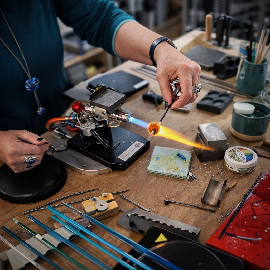 In mijn atelier kan ik helemaal opgaan in het maken van nieuwe kralen en sieraden.